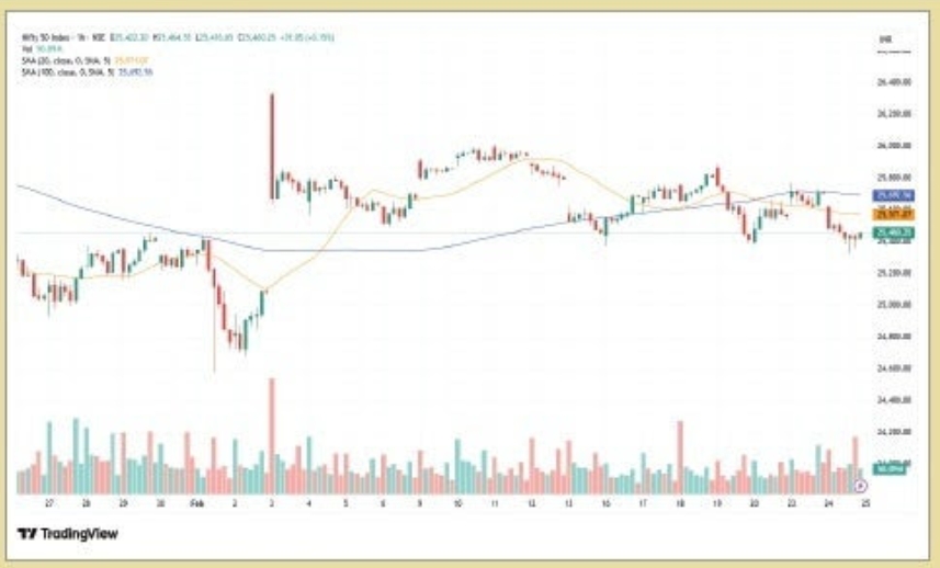 ટેકનિકલી જોઇએ તો NIFTY તમામ મુખ્ય મૂવિંગ એવરેજ (200-દિવસના EMA સિવાય) નીચે સરકી ગયો, જ્યારે મોમેન્ટમ ઇન્ડિકેટર્સે વેચાણનો સંકેત આપ્યો અને વોલેટિલિટી ઇન્ડેક્સ 14 ઝોનથી ઉપર રહ્યો. જો તીવ્ર વેચવાલી પછી NIFTY પાછો ફરે, તો તેને 25,500–25,600ના રેઝિસ્ટન્સનો સામનો કરવો પડી શકે છે. જોકે, વધુ કોન્સોલિડેશનના કિસ્સામાં, જો તે નિર્ણાયક રીતે 25,400થી નીચે આવે છે તો NIFTY 25,300–25,200ના લેવલનું ફરીથી પરીક્ષણ કરી શકે છે.