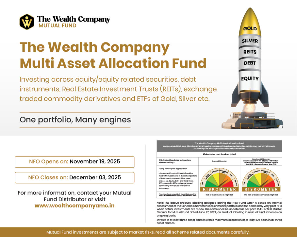 અમદાવાદ, 15 નવેમ્બર: પેન્ટોમેથ ફાયનાન્શિયલ સર્વિસિસ ગ્રુપ અંતર્ગત ભારતની સૌથી ઝડપભેર વિકાસ પામી રહેલી એએમસી પૈકીની એક ધ વેલ્થ કંપની એસેટ મેનેજમેન્ટ હોલ્ડિંગ્સ પ્રાઈવેટ લિમિટેડ દ્વારા ‘ધ વેલ્થ કંપની મલ્ટી એસેટ એલોકેશન ફંડ’ લોંચ કરી રહી છે. આ ટ્રુ-ટુ-લેબલ હાઈબ્રિડ કોમોડિટી-એન્કર્ડ મલ્ટી-એસેટ ફંડ ઈક્વિટી, ડેટ અને કોમોડિટીઝમાં સંતુલન બનાવશે. આ રીતે માર્કેટ સાઈકલ્સમાં સાનુકૂળ રીતે અને સારી રીતે વૈવિધ્યસભર પોર્ટફોલિયો બનાવીને રોકાણકારોને લાંબા ગાળા માટે સંપત્તિ સર્જન કરવામાં મદદરૂપ બને છે. આ ન્યુ ફંડ ઓફર (એનએફઓ) 19મી નવેમ્બર,2026ના રોજ ખુલશે અને 3 ડિસેમ્બર 2025ના રોજ બંધ થશે.